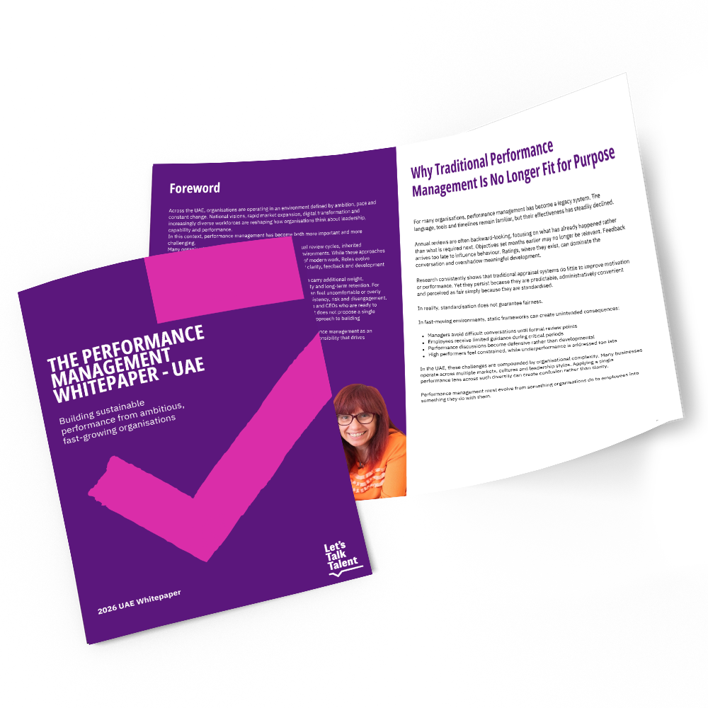 The 2026 UAE Whitepaper by Let’s Talk Talent proposes a critical shift: moving away from performance management as a compliance process organisations do to employees, and towards performance as a shared responsibility they do with them. Designed specifically for CEOs and Senior HR Leaders, this guide does not offer a “quick fix” or a single rigid model. Instead, it outlines a human-centred, practical approach to building systems that are clear, fair, and adaptable to the unique complexities of the modern UAE workforce. From navigating diverse cultural expectations to managing rapid scale, this resource provides the strategic roadmap needed to turn performance management from a box-ticking exercise into a dynamic driver of sustainable organisational success.